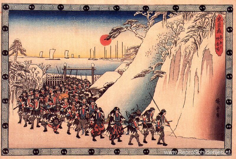 Wij bieden u een ambachtelijke reproductie op doek van het beroemde schilderij 'Ronin gaat de Sengakuji-tempel binnen om hulde te brengen aan hu' van Hiroshige, afkomstig uit het Reproductiemuseum.