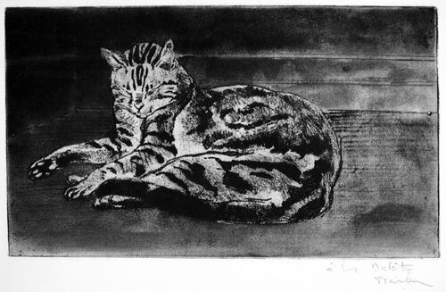 Wij bieden u een ambachtelijke reproductie op doek van het beroemde schilderij 'Chat op de vloer' van Theophile Steinlen, afkomstig uit het Reproductiemuseum.