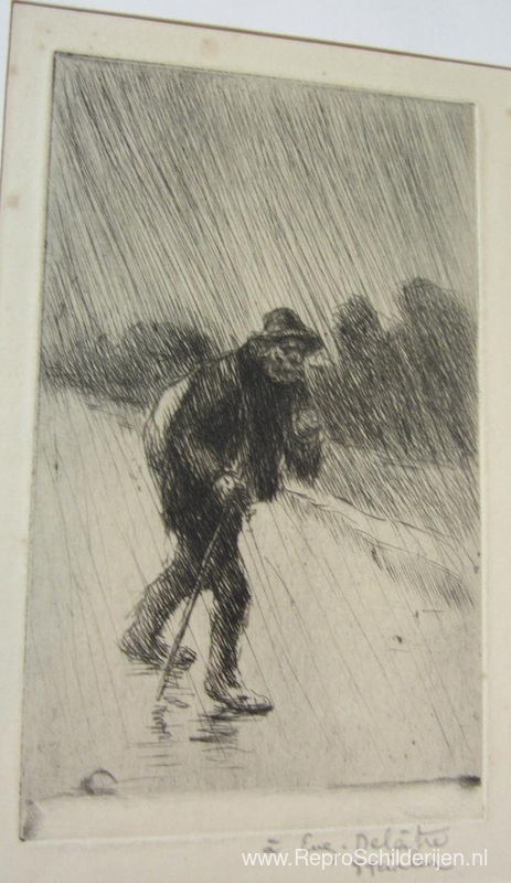 Wij bieden u een ambachtelijke reproductie op doek van het beroemde schilderij 'Chemineau Sous La Pluie' van Theophile Steinlen, afkomstig uit het Reproductiemuseum.