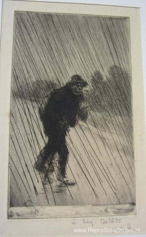 Wij bieden u een ambachtelijke reproductie op doek van het beroemde schilderij 'Chemineau Sous La Pluie' van Theophile Steinlen, afkomstig uit het Reproductiemuseum.