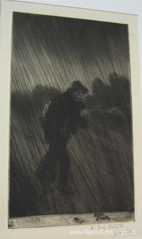 Wij bieden u een ambachtelijke reproductie op doek van het beroemde schilderij 'Chemineau Sous La Pluie' van Theophile Steinlen, afkomstig uit het Reproductiemuseum.
