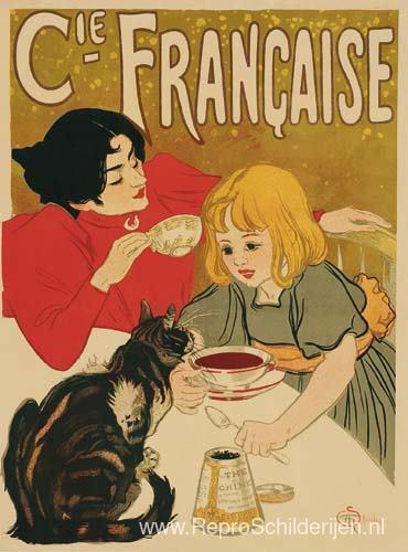 Wij bieden u een ambachtelijke reproductie op doek van het beroemde schilderij 'Compagnie Francaise des Chocolats et des Thes' van Theophile Steinlen, afkomstig uit het Reproductiemuseum.