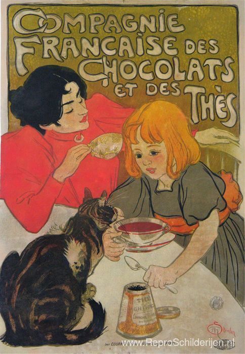 Wij bieden u een ambachtelijke reproductie op doek van het beroemde schilderij 'Compagnie Francaise des Chocolats et des Thes' van Theophile Steinlen, afkomstig uit het Reproductiemuseum.