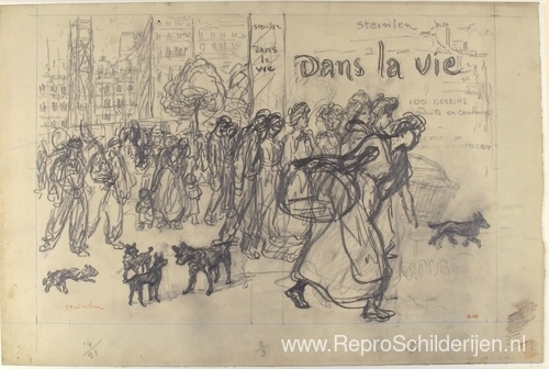 Wij bieden u een ambachtelijke reproductie op doek van het beroemde schilderij 'Dans La Vie - tekening van de boekomslag' van Theophile Steinlen, afkomstig uit het Reproductiemuseum.