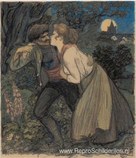 Wij bieden u een ambachtelijke reproductie op doek van het beroemde schilderij 'De vrouwelijke hond en de Wolf' van Theophile Steinlen, afkomstig uit het Reproductiemuseum.