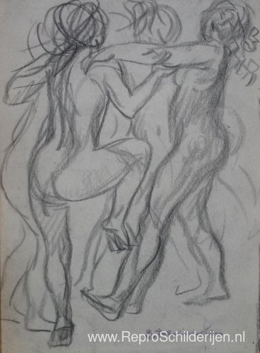 Wij bieden u een ambachtelijke reproductie op doek van het beroemde schilderij 'Drie naakte vrouwen dansen ' van Theophile Steinlen, afkomstig uit het Reproductiemuseum.