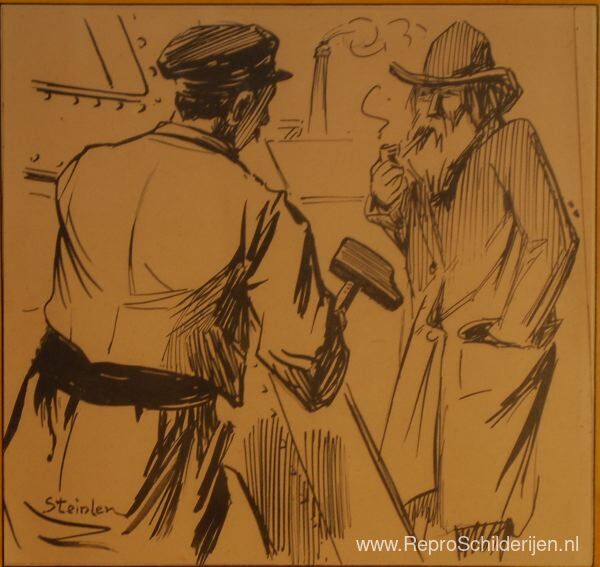 Wij bieden u een ambachtelijke reproductie op doek van het beroemde schilderij 'Gesprek Op Een Bouwplaats' van Theophile Steinlen, afkomstig uit het Reproductiemuseum.