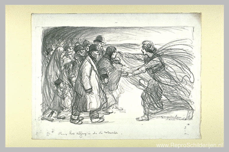 Wij bieden u een ambachtelijke reproductie op doek van het beroemde schilderij 'Giet Les Refugies de la Meuse ' van Theophile Steinlen, afkomstig uit het Reproductiemuseum.