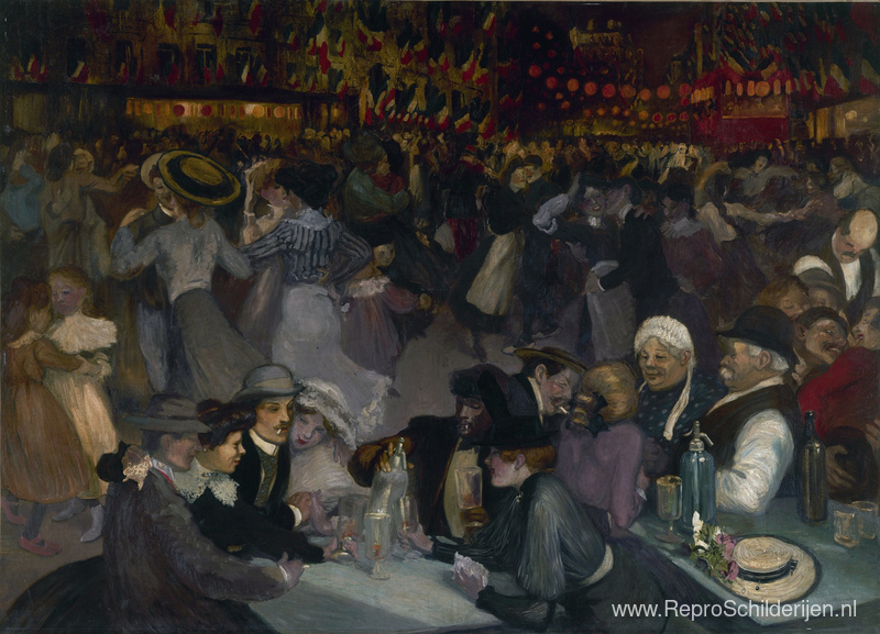 Wij bieden u een ambachtelijke reproductie op doek van het beroemde schilderij 'Het bal van 14 juli ' van Theophile Steinlen, afkomstig uit het Reproductiemuseum.