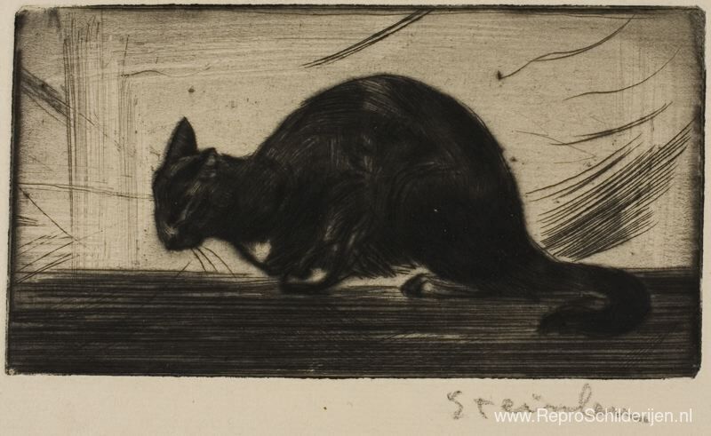 Wij bieden u een ambachtelijke reproductie op doek van het beroemde schilderij 'Kat die grote rug maakt' van Theophile Steinlen, afkomstig uit het Reproductiemuseum.
