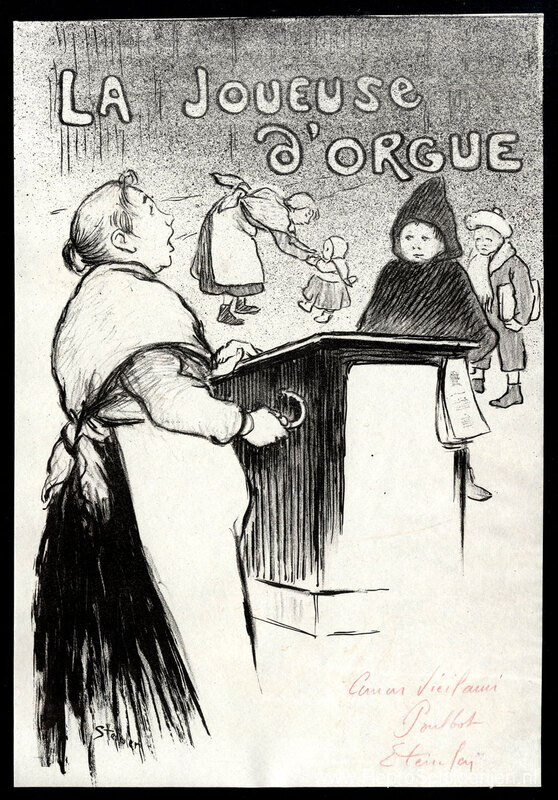 Wij bieden u een ambachtelijke reproductie op doek van het beroemde schilderij 'La Joueuse D'Orgue ' van Theophile Steinlen, afkomstig uit het Reproductiemuseum.