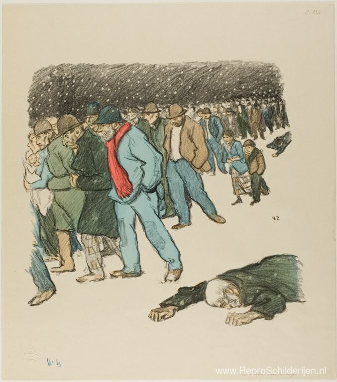 Wij bieden u een ambachtelijke reproductie op doek van het beroemde schilderij 'La Misere Sous La Neige' van Theophile Steinlen, afkomstig uit het Reproductiemuseum.