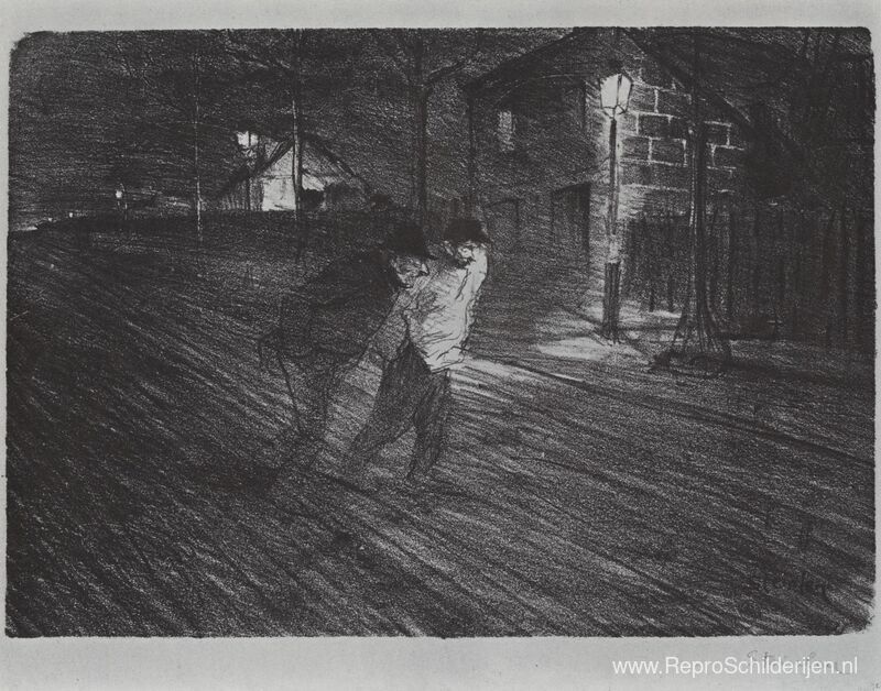 Wij bieden u een ambachtelijke reproductie op doek van het beroemde schilderij 'La Rue Caulaincourt ' van Theophile Steinlen, afkomstig uit het Reproductiemuseum.