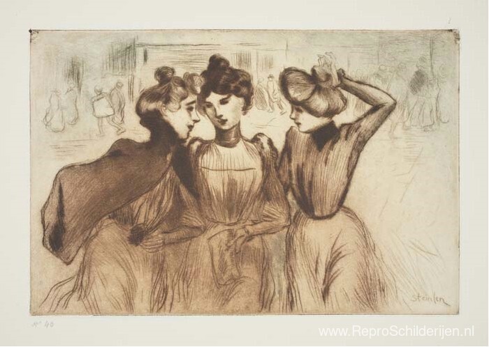 Wij bieden u een ambachtelijke reproductie op doek van het beroemde schilderij 'La Sortie des Trois Midinettes ' van Theophile Steinlen, afkomstig uit het Reproductiemuseum.