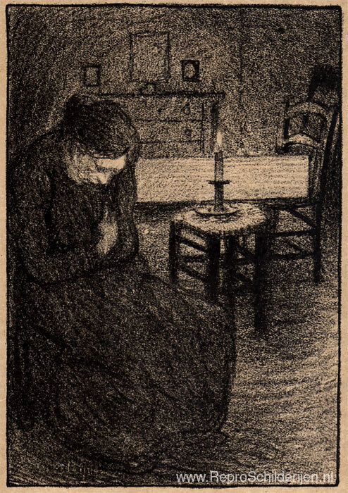 Wij bieden u een ambachtelijke reproductie op doek van het beroemde schilderij 'La Veillee ' van Theophile Steinlen, afkomstig uit het Reproductiemuseum.