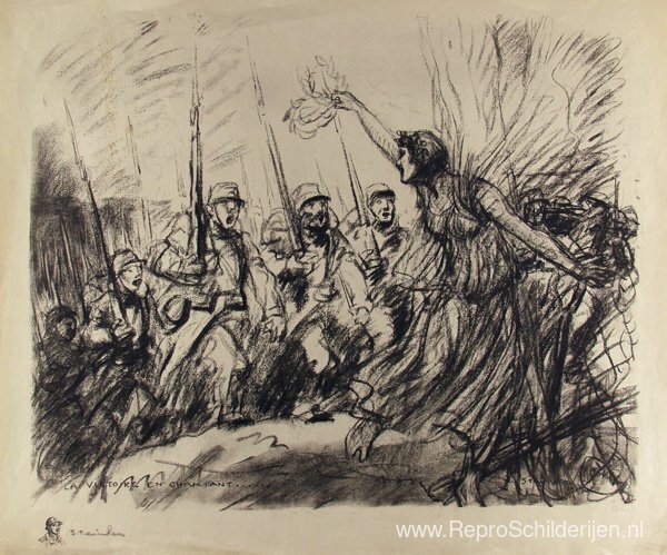 Wij bieden u een ambachtelijke reproductie op doek van het beroemde schilderij 'La Victoire en chantant' van Theophile Steinlen, afkomstig uit het Reproductiemuseum.