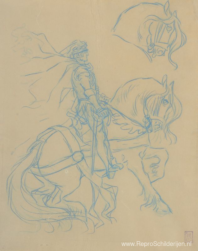Wij bieden u een ambachtelijke reproductie op doek van het beroemde schilderij 'Le Chevalier a la Fee' van Theophile Steinlen, afkomstig uit het Reproductiemuseum.