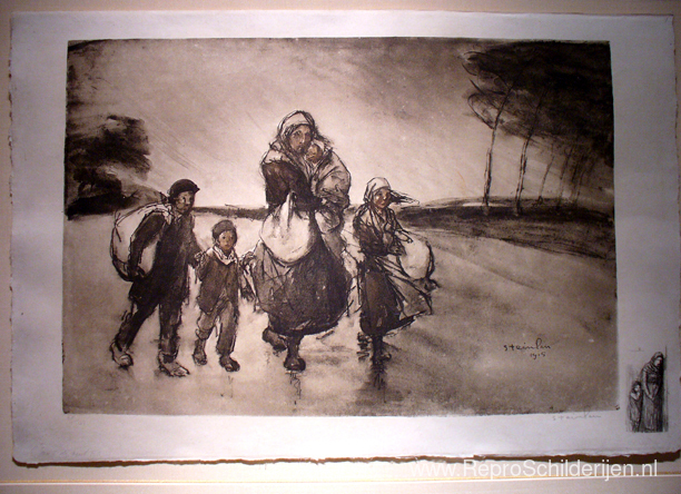 Wij bieden u een ambachtelijke reproductie op doek van het beroemde schilderij 'Le Coup de Vent Vers L'Inconnu ' van Theophile Steinlen, afkomstig uit het Reproductiemuseum.