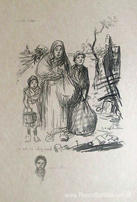 Wij bieden u een ambachtelijke reproductie op doek van het beroemde schilderij 'Le Retour - C'Est Ici Chez Nous ' van Theophile Steinlen, afkomstig uit het Reproductiemuseum.