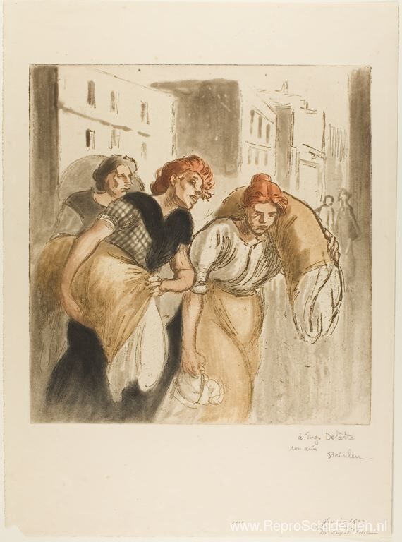 Wij bieden u een ambachtelijke reproductie op doek van het beroemde schilderij 'Le Retour du Lavoir' van Theophile Steinlen, afkomstig uit het Reproductiemuseum.