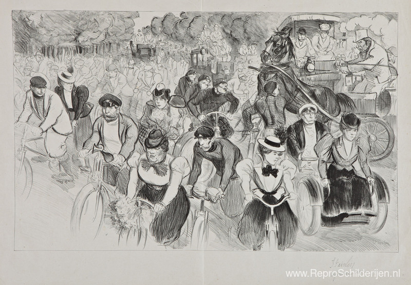 Wij bieden u een ambachtelijke reproductie op doek van het beroemde schilderij 'Les Cyclistes ' van Theophile Steinlen, afkomstig uit het Reproductiemuseum.