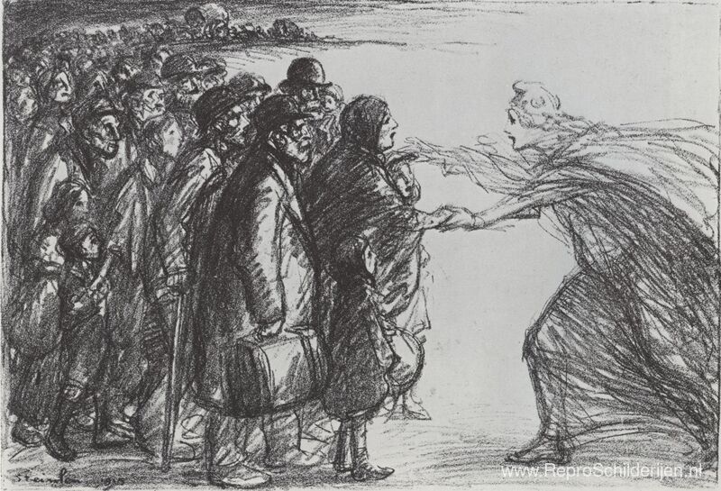 Wij bieden u een ambachtelijke reproductie op doek van het beroemde schilderij 'Les Refugies de la Meuse ' van Theophile Steinlen, afkomstig uit het Reproductiemuseum.