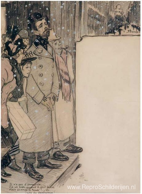 Wij bieden u een ambachtelijke reproductie op doek van het beroemde schilderij 'Lied du Joli Temps Tout en Neige ' van Theophile Steinlen, afkomstig uit het Reproductiemuseum.