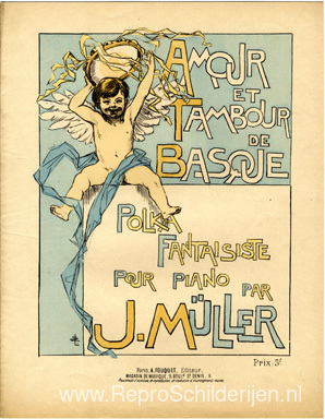 Wij bieden u een ambachtelijke reproductie op doek van het beroemde schilderij 'Liefde en Baskische Drum' van Theophile Steinlen, afkomstig uit het Reproductiemuseum.