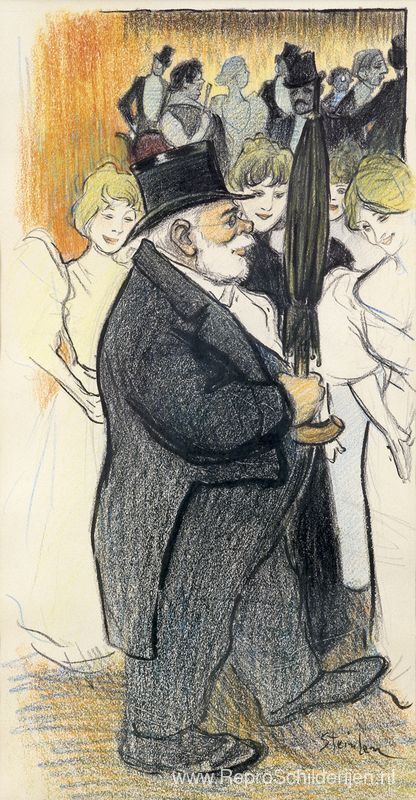Wij bieden u een ambachtelijke reproductie op doek van het beroemde schilderij 'Man met paraplu' van Theophile Steinlen, afkomstig uit het Reproductiemuseum.