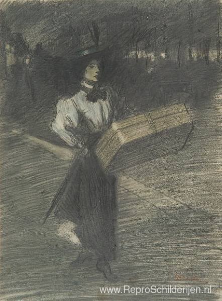 Wij bieden u een ambachtelijke reproductie op doek van het beroemde schilderij 'Meisje met koffer ' van Theophile Steinlen, afkomstig uit het Reproductiemuseum.