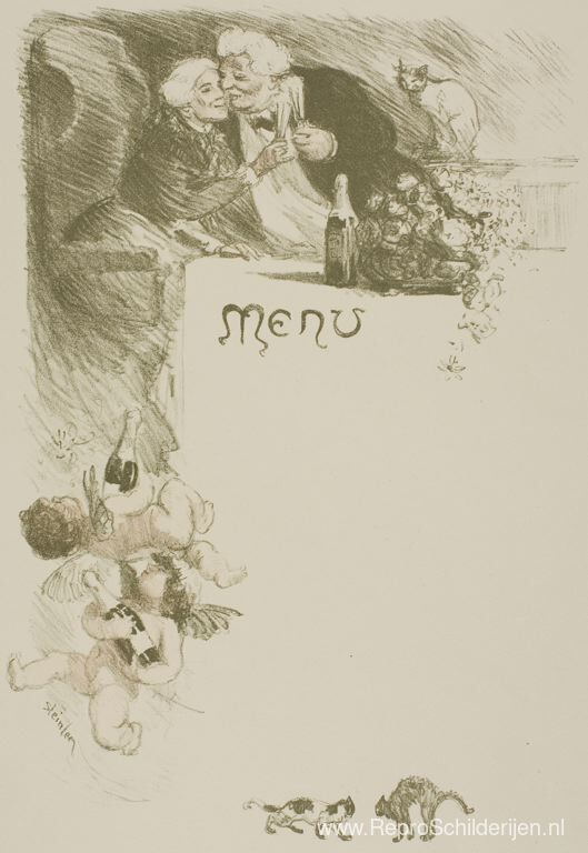 Wij bieden u een ambachtelijke reproductie op doek van het beroemde schilderij 'Menu Henriot ' van Theophile Steinlen, afkomstig uit het Reproductiemuseum.