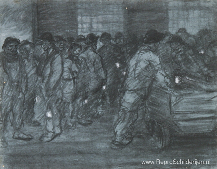Wij bieden u een ambachtelijke reproductie op doek van het beroemde schilderij 'Mijnwerkers met lantaarns' van Theophile Steinlen, afkomstig uit het Reproductiemuseum.