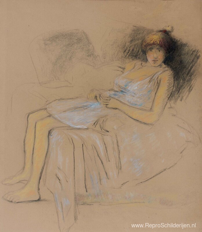 Wij bieden u een ambachtelijke reproductie op doek van het beroemde schilderij 'Model in rust ' van Theophile Steinlen, afkomstig uit het Reproductiemuseum.