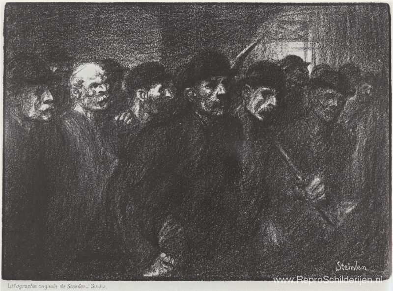 Wij bieden u een ambachtelijke reproductie op doek van het beroemde schilderij 'Ouvriers Sortant de L'Usine ' van Theophile Steinlen, afkomstig uit het Reproductiemuseum.