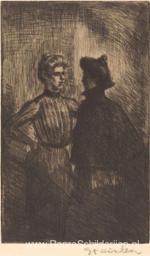 Wij bieden u een ambachtelijke reproductie op doek van het beroemde schilderij 'Rencontre ' van Theophile Steinlen, afkomstig uit het Reproductiemuseum.