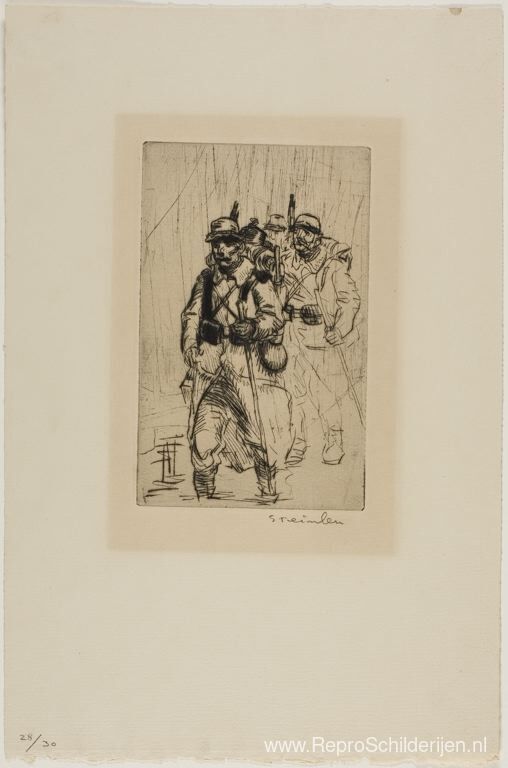 Wij bieden u een ambachtelijke reproductie op doek van het beroemde schilderij 'Soldats Sous La Pluie en Dans Les Fondrieres ' van Theophile Steinlen, afkomstig uit het Reproductiemuseum.