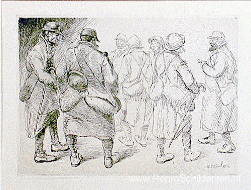 Wij bieden u een ambachtelijke reproductie op doek van het beroemde schilderij 'Toestemminghouders nr. 2' van Theophile Steinlen, afkomstig uit het Reproductiemuseum.