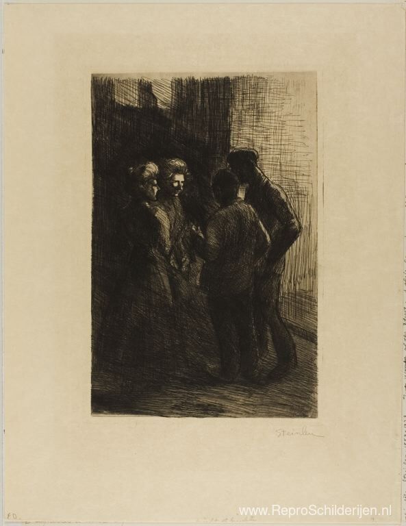 Wij bieden u een ambachtelijke reproductie op doek van het beroemde schilderij 'Twee gigoletten en twee gigolo's ' van Theophile Steinlen, afkomstig uit het Reproductiemuseum.