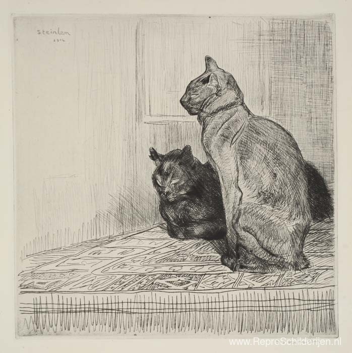Wij bieden u een ambachtelijke reproductie op doek van het beroemde schilderij 'Twee katten op een kast ' van Theophile Steinlen, afkomstig uit het Reproductiemuseum.