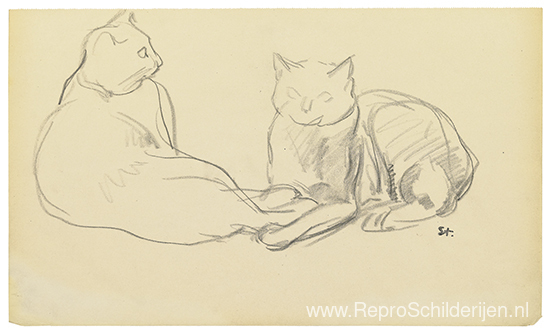 Wij bieden u een ambachtelijke reproductie op doek van het beroemde schilderij 'Twee katten' van Theophile Steinlen, afkomstig uit het Reproductiemuseum.
