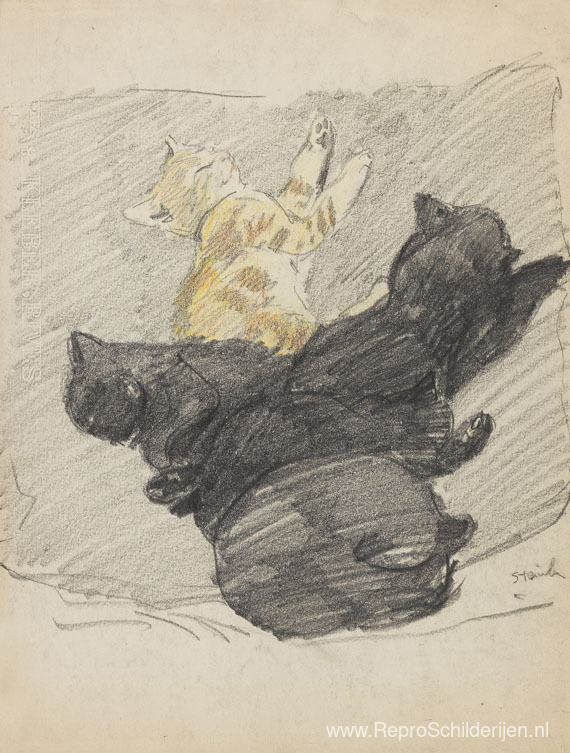 Wij bieden u een ambachtelijke reproductie op doek van het beroemde schilderij 'Vijf slapende katten ' van Theophile Steinlen, afkomstig uit het Reproductiemuseum.