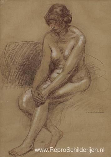Wij bieden u een ambachtelijke reproductie op doek van het beroemde schilderij 'Vrouw Nue ' van Theophile Steinlen, afkomstig uit het Reproductiemuseum.