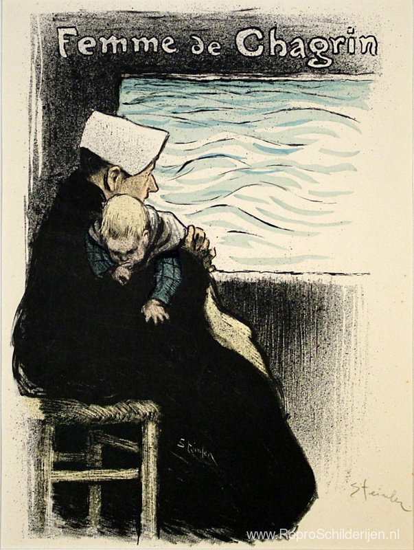 Wij bieden u een ambachtelijke reproductie op doek van het beroemde schilderij 'Vrouw van Chagrin' van Theophile Steinlen, afkomstig uit het Reproductiemuseum.