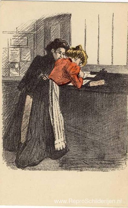 Wij bieden u een ambachtelijke reproductie op doek van het beroemde schilderij 'Vrouwen aan de balie' van Theophile Steinlen, afkomstig uit het Reproductiemuseum.
