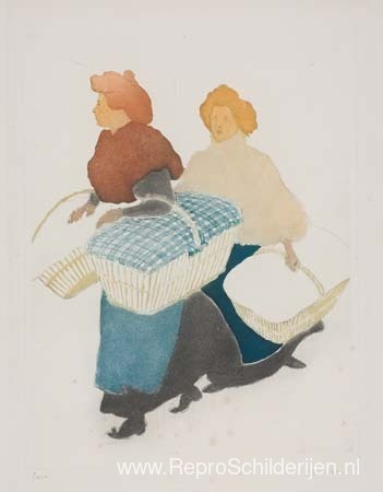 Wij bieden u een ambachtelijke reproductie op doek van het beroemde schilderij 'Wasvrouwen dragen linnen' van Theophile Steinlen, afkomstig uit het Reproductiemuseum.