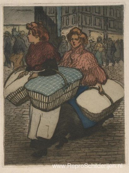 Wij bieden u een ambachtelijke reproductie op doek van het beroemde schilderij 'Wasvrouwen dragen linnen' van Theophile Steinlen, afkomstig uit het Reproductiemuseum.