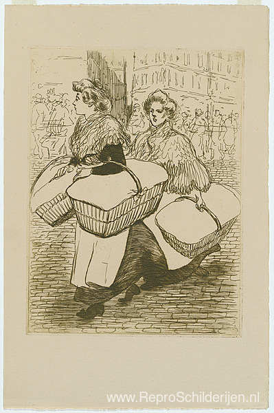 Wij bieden u een ambachtelijke reproductie op doek van het beroemde schilderij 'Wasvrouwen dragen linnen ' van Theophile Steinlen, afkomstig uit het Reproductiemuseum.