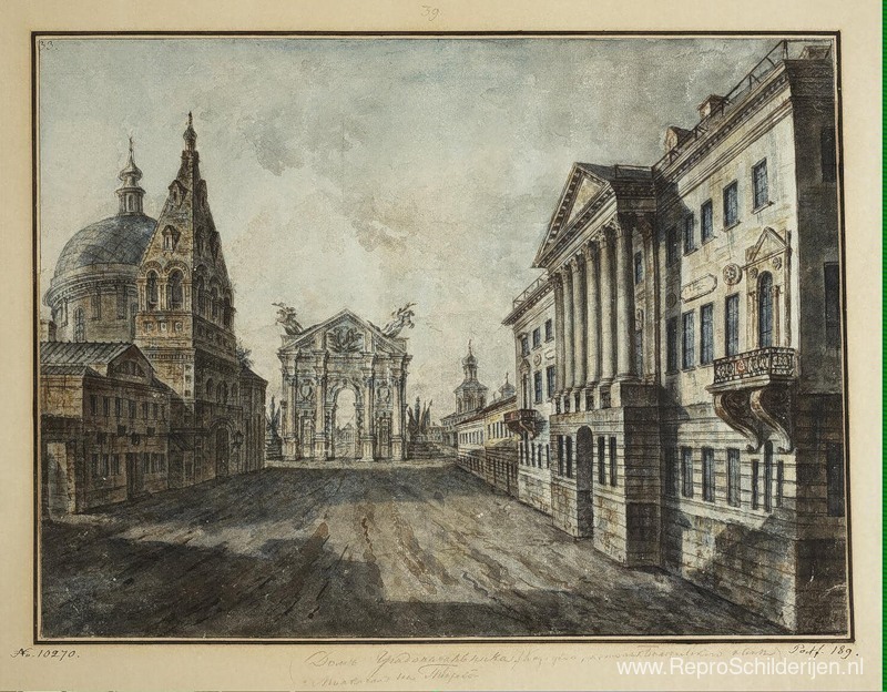 Wij bieden u een ambachtelijke reproductie op doek van het beroemde schilderij 'Tverskaya Street en triomfboog op het Strastnaya-plein' van Fyodor Alekseyev, afkomstig uit het Reproductiemuseum.