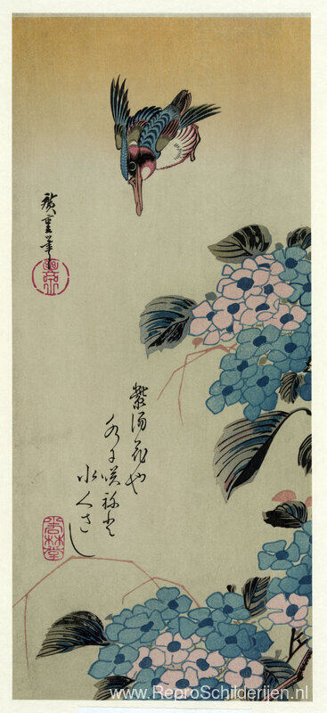 Wij bieden u een ambachtelijke reproductie op doek van het beroemde schilderij 'Hortensia en ijsvogel' van Hiroshige, afkomstig uit het Reproductiemuseum.