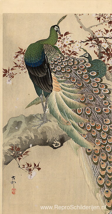 Wij bieden u een ambachtelijke reproductie op doek van het beroemde schilderij 'Twee groene pauwen op de tak van een bloeiende boom' van Ohara Koson, afkomstig uit het Reproductiemuseum.